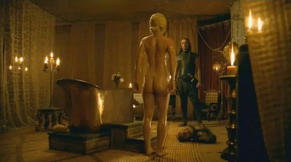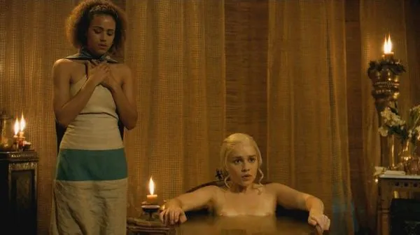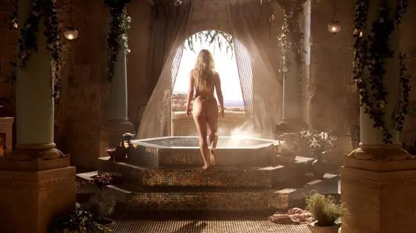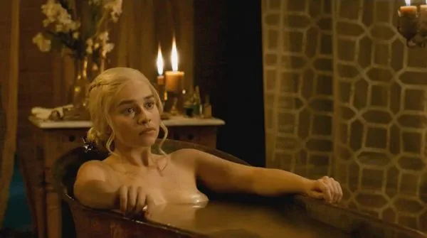 Emilia Clarke on alasti vannis ja räägib poisiga ning tema paljad rinnad ja poolenisti veega kaetud nibud. Ta tõuseb püsti ja me näeme nüüd tema alasti rindu ja kindlaid tuharaid hästi.
