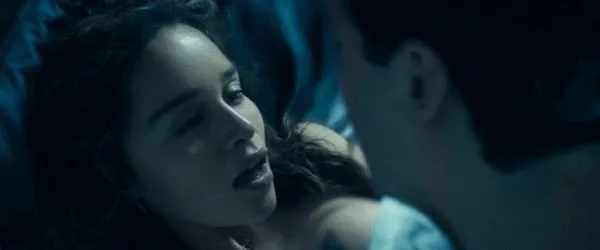 Emilia Clarke lamab tüübiga voodis ja laseb tal end peal veeretada, paljastades peaaegu tema rinnad, kuid tema nibud jäävad lihtsalt silma alt ära, kui tema ja poiss räägivad ning ta suudleb teda, hoides end kaenla alt üles.