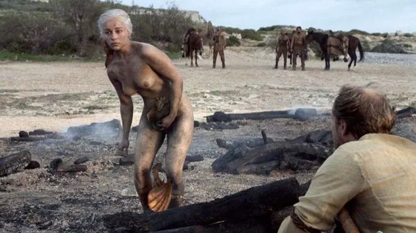 Selles stseenis näeme kustutatud tule jäänustes ristis jalgadega Emilia Clarke alastit. Näeme tema alasti rindu, kui ta hoiab süles draakonit ja tõuseb püsti, kattes oma tuss teise draakoniga.