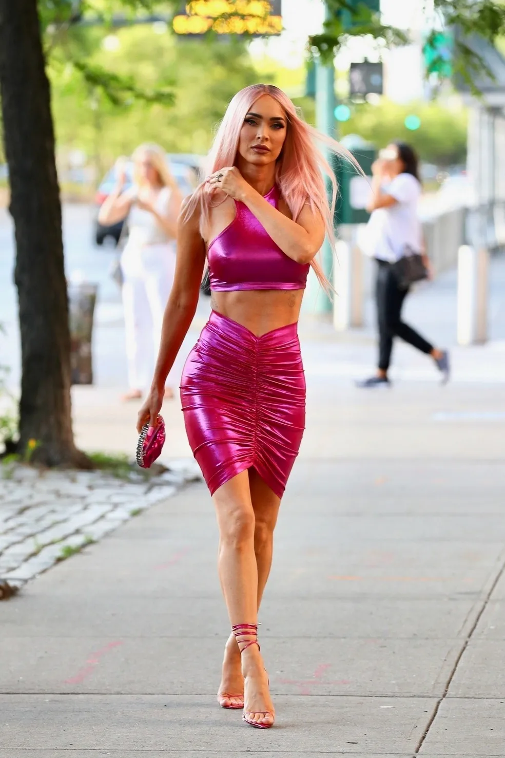 Fotograaf mõistis, et Megan Fox oli New Yorgis väga heledates rõivastes. 36 -yar -El valis fantastilise fuchie mängu, mis koosneb seelikust ja ekraanist. Kuulsused lõpetasid oma tegelaskujude sandaalid ja väikese teemantproovi vöökastiga. Pidage meeles, et brünett otsustas hiljuti pilti muuta. Megan valgustab juukseid ja loob puhta roosa meloodia.